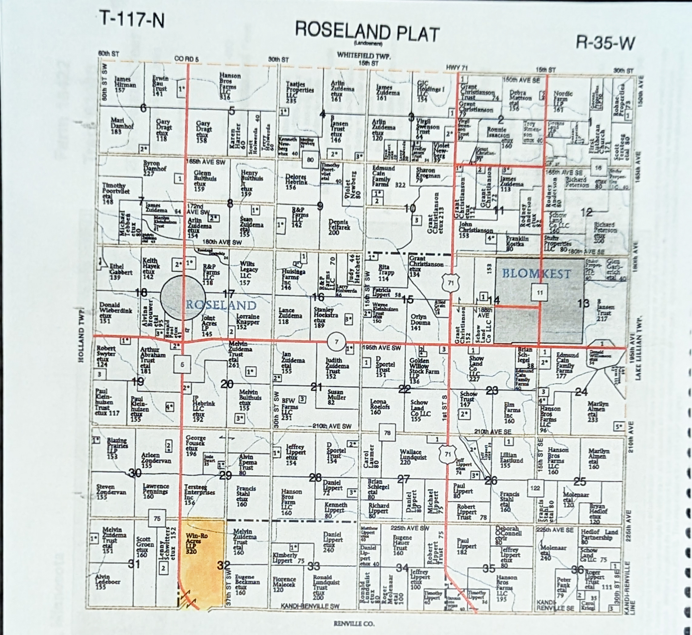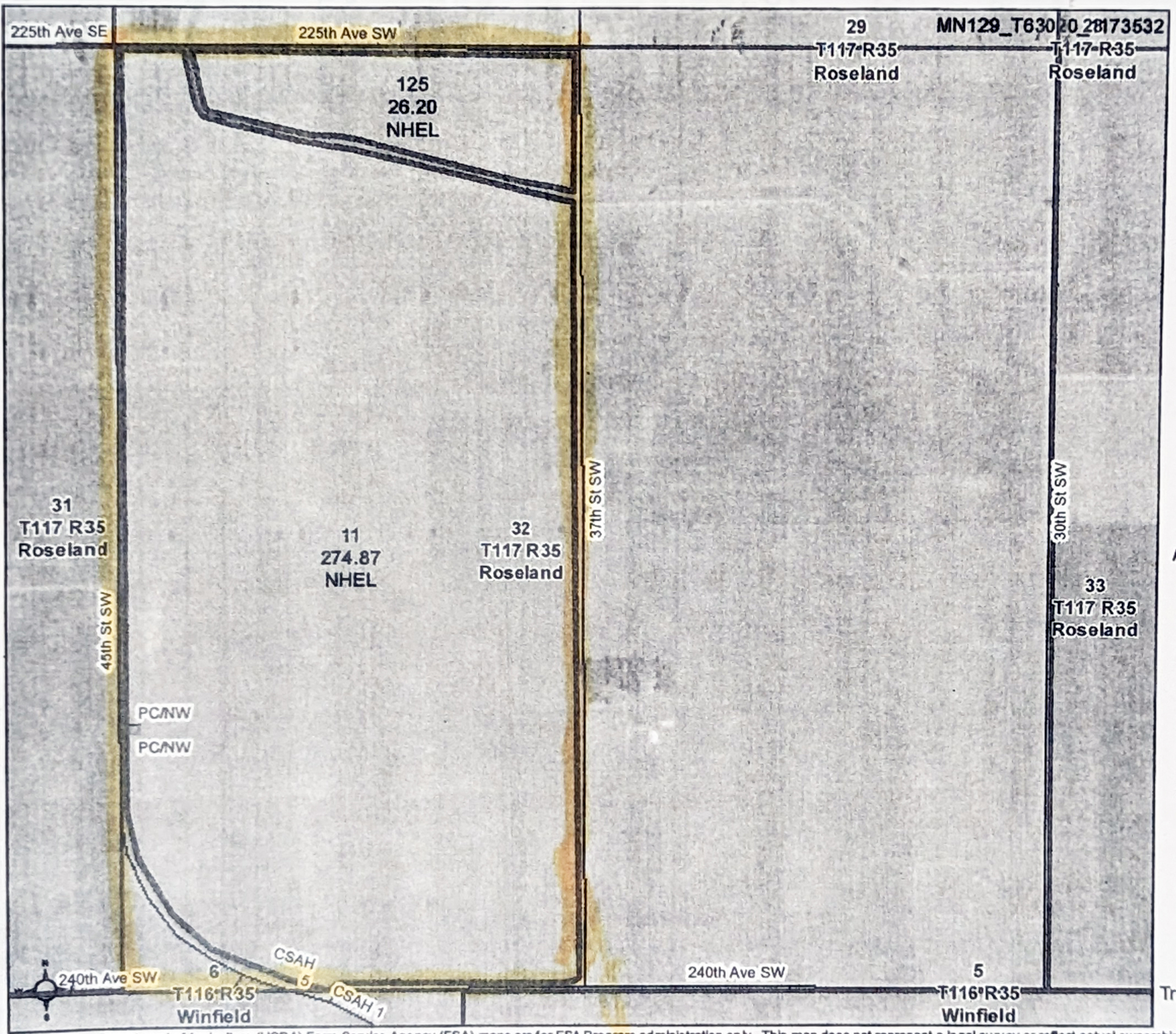 Legal Description: Kandiyohi Co. Parcel #: 29-032-0020; Exact Legal description to govern to be provided by Seller @ Closing. Tract located in the W 1⁄2 of Section 32, T117N, R35W; Roseland Township